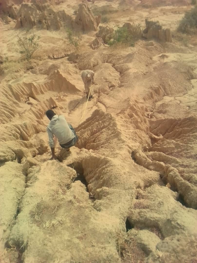6. Gadau Gully Erosion/Flood Site (Sabon Wuya): This is another emergency graded problem site which affects up to 3000 hectares of farmland with a population of about 300,000 people depending on those farmlands for their economic activities. The gullies which were beginning to turn into flowing streams stated ravaging the area about 5 years ago, from 2016 when our Team visited the area. Gullies measured 40 meters wide, 21 meters deep and all together 5000 meters long. The area needs extensive sand-filling, embankments and Jathropha planning and nursing. The soil in the area had lost a high quantum of its nutrient contents as a result of the state of degradation. Gajara land, in the same district suffers degradation effects that had rendered up to 100 hectares of farmlands almost valueless. Mitigation structures needed in the area are extensive sand-filling, reclamation plans through Jathropha planting and nursing.